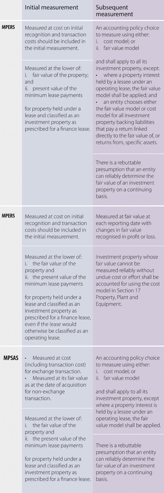 In this article, we analyse the accounting treatment for investment property under Malaysian Public Sector Accounting Standard (MPSAS) 16, Malaysian Financial Reporting Standard (MFRS) 140 and Section 16 of Malaysian Private Entities Reporting Standard (MPERS).