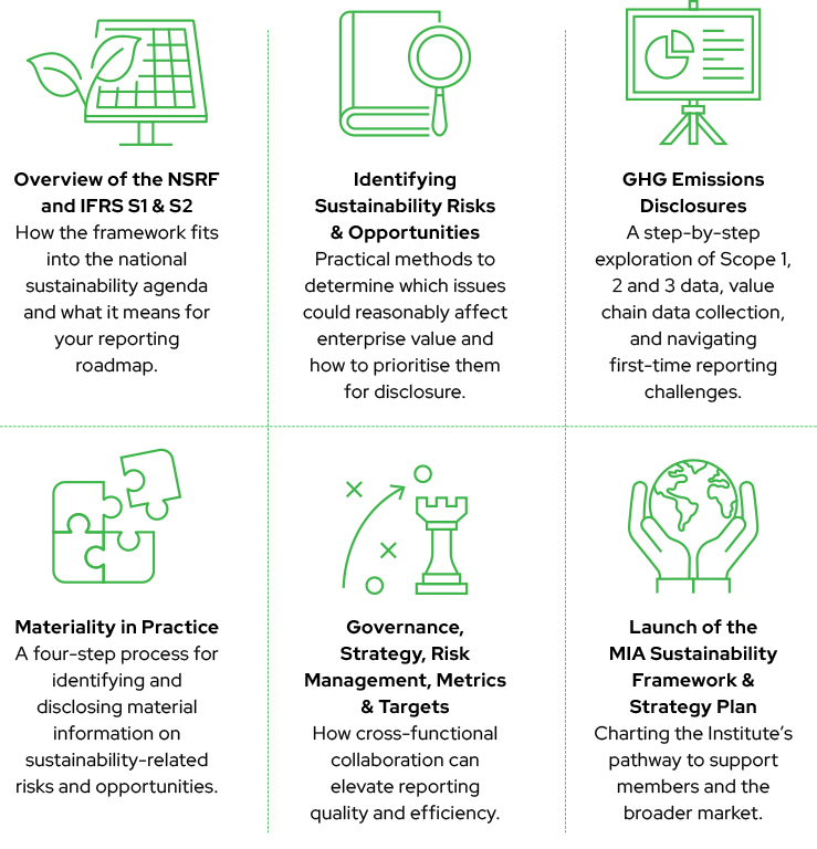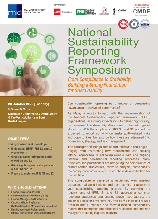 To help finance and sustainability leaders progress from understanding “what to report” to mastering “how to report effectively,” MIA will be organising the National Sustainability Reporting Framework Symposium on 28 October 2025 at the Connexion Conference & Event Centre @ The Vertical, Bangsar South, Kuala Lumpur.
