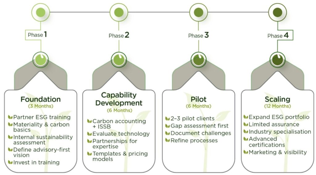 The scaling phase, typically spanning twelve months, focuses on expanding the client base and enhancing service sophistication. Gradually progress from advisory to limited assurance services as capabilities strengthen. Develop industry specialisations by leveraging existing client relationships and sector expertise. Invest in advanced training for key staff including international sustainability certifications where relevant. Implement marketing strategies that showcase ESG capabilities and successful client engagements.