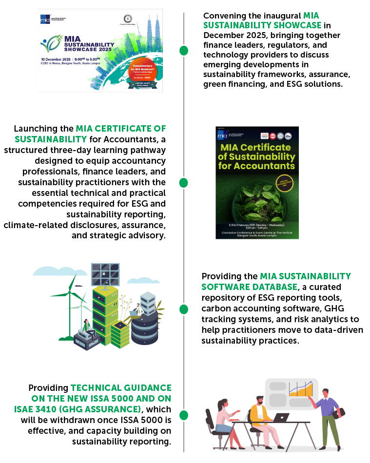 MIA is delivering 169 initiatives over a five-year span for advocacy, competency and capacity building, including structured upskilling, CPD programmes, and technical tools and guidance to equip members with new competencies in sustainability reporting, sustainability assurance, sustainability-related risk management and others.