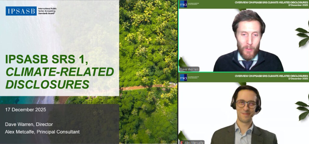 The Institute organised a complimentary webinar titled “Overview on IPSASB SRS Climate-related Disclosures” in December 2025, featuring Dave Warren, Director of the International Public Sector Accounting Standards Board (IPSASB) and Alexander Metcalfe, Principal Consultant at IPSASB.