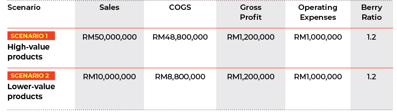 As evident from the above, even though sales values differ drastically (RM50 Mil vs RM10 Mil), the Berry Ratio remains the same (1.2) because the company’s value creation is tied to operating expenses, not to the sales value of the products.