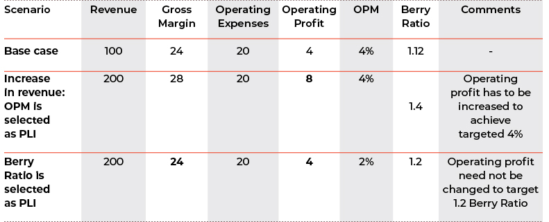 - Under Berry Ratio: The ratio is tied to operating expenses instead of revenue, therefore increase in revenue does not lead to an expectation of increase in profit to meet the arm’s length principle. Under the Berry Ratio, profit is expected to be increased only in case of increase in operating expenses. Therefore, this ratio is apt for entities with limited functionality, wherein expenses typically do not scale in proportion to sales, making Berry Ratio outcomes relatedly flat compared to OPM as PLI.